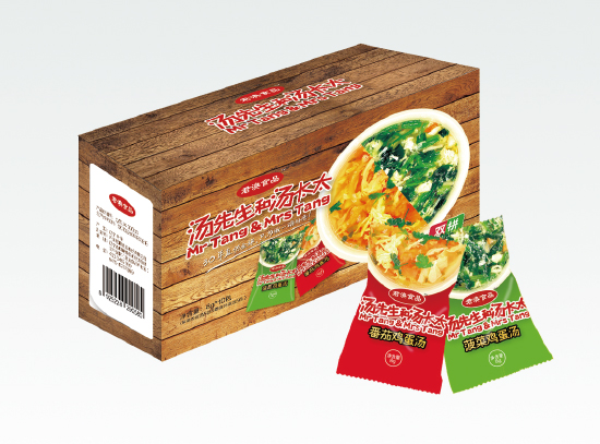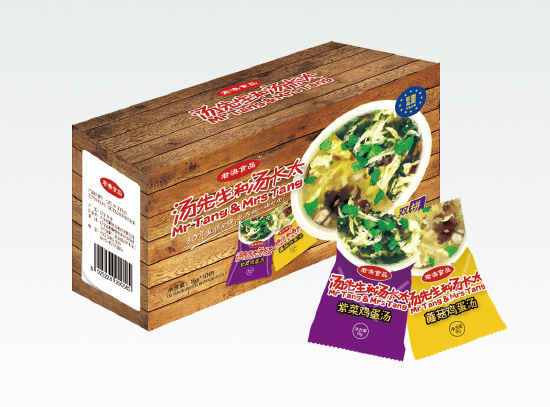 包装设计整体采用模拟木箱形式,既与食材的绿色健康调性一致,又在大众包装的行列中特例独行。画面上的一碗热汤两个口味,代表包装内部两种口味的的结构。包装内部采用“双拼”结构,单袋包装的两个口味包均采用互补色,是视觉上的高级搭配。